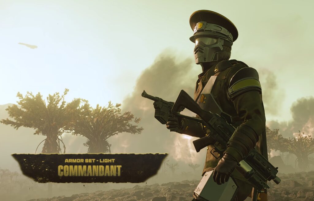 “But let’s say you need to look more official to motivate the squad stuck in the battle trenches. For that, you’ll want the CPH-26 Commandant light armor with–as pristine as your service record, with a high collar to match your high ambition to move up through the ranks. It’s the kind of fit that says I could court-martial you at any time, and pairs perfectly with the Crest of the Unsullied cape and player card. It also has its own version of the Concussive Padding passive–Hazmat–which provides both explosive and gas damage resistance, as well as reduced sidearm recoil.”