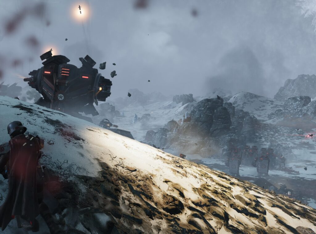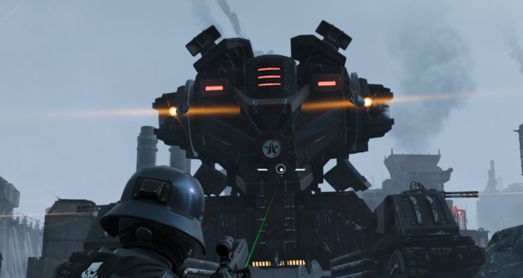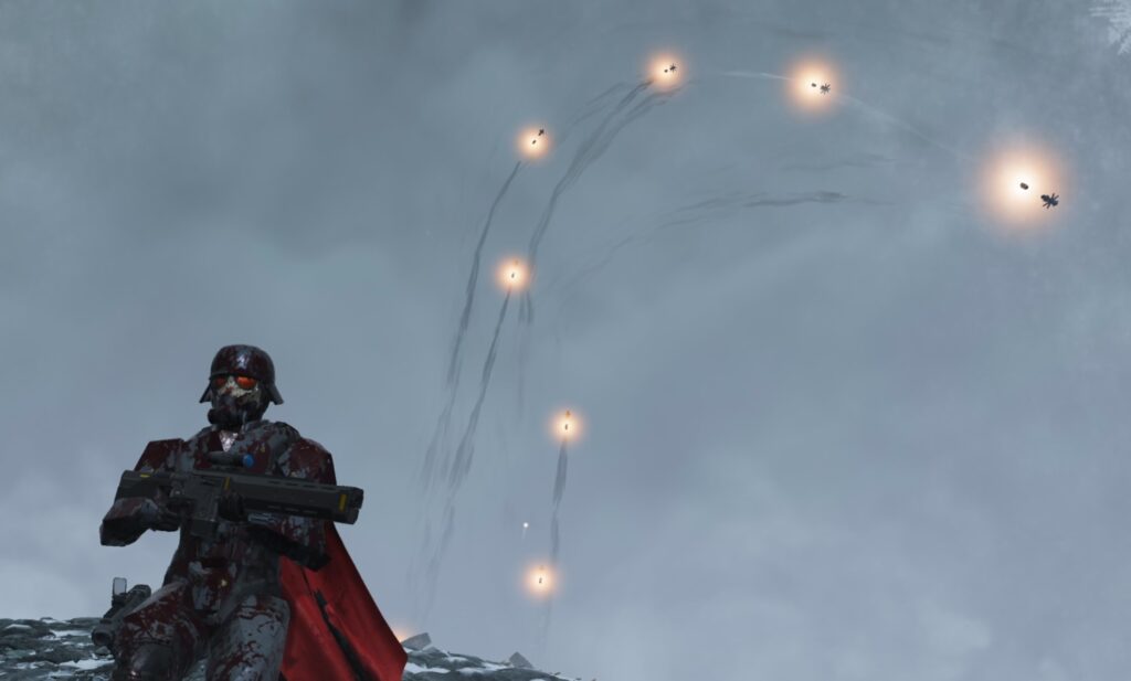 Their third attack is a missile array, which fires a volley of missiles to blanket an entire area. Missiles by themselves only have a medium explosion radius, and the ground gets highlighted to telegraph where missiles will land, but if you are wearing light armor a direct hit from even a single missile means death. Vox Engines often use this attack to force Helldivers out of cover.