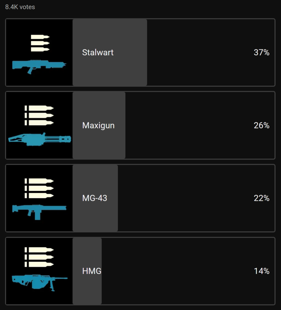 More than 8,000 players voted in this poll, with 37% choosing the Stalwart as their favorite machine gun. The new and fiery Maxigun came in second with 26%, followed closely by the MG-43 at 22%. The HMG landed in last place with 14%.